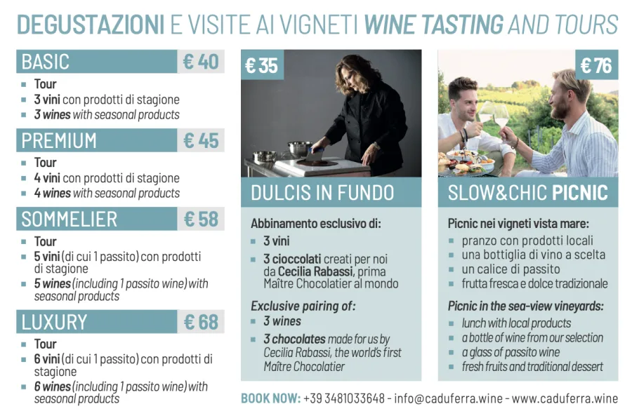 Davide and Giuseppe offer several vineyard tours and wine-tasting combinations (I enjoyed the Sommelier one, with one rosé, two whites, one red and one passito – a sweet wine made from dried grapes, sometimes loosely referred to as “straw wine” or “raisin wine”- all served with local products and treats), from a basic to a luxury one. I even decided to offer them to my guests at the Oasi Boutique Hotel in Levanto.
